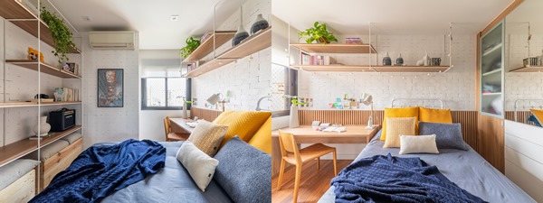 No dormitório da filha do casal, o arquiteto Pietro Terlizzi considerou a instalação de uma bancada de madeira para que a jovem possa desenhar, um dos seus hobbies preferida. A estante chama atenção com sua diagramação fora do convencional com as gavetas, porta e espelho | Fotos: Guilherme Pucci