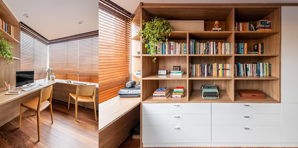 A madeira mandorla marca presença na mesa e na estante do local de trabalho, executadas pela SCA Jardim Europa. As gavetas de MDF branco conferiram um ar leve e sutil ao espaço e a ampla janela, que acompanha toda a extensão da mesa, permite uma ótima iluminação natural para conforto visual durante as atividades profissionais | Fotos: Guilherme Pucci
