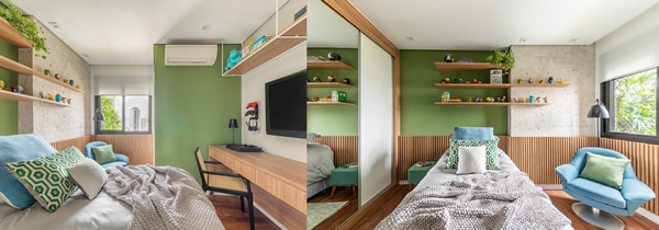 O quarto do filho mais novo do casal foi projetado para acompanhar o seu crescimento já na pré-adolescência. O arquiteto Pietro Terlizzi apostou no lambri de madeira mandorla, com a iluminação indireta em led e uma paleta vibrante com pontos de cores nas paredes, enxoval e na poltrona.
