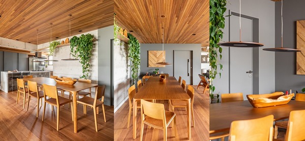 Na sala de jantar o arquiteto Pietro Terlizzi infundiu a harmonização dos elementos de acabamento. Para tanto, forro e piso, ambos em madeira cumaru, emolduram a sala em um contraponto com o concreto e o cinza, além do verde natural das plantas. Nos detalhes, o quadro de madeira entrega recordações e histórias, visto que fazia parte de uma antiga porta do apartamento | Fotos: Guilherme Pucci