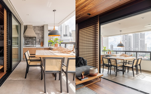 “Não integramos totalmente a varanda com a sala, mas conseguimos proporcionar uma área externa para desfrutar os momentos em família e era exatamente isso que os moradores desejavam!”, ressalta o arquiteto. No canto da varanda, um sofá deixa o ambiente ainda mais aconchegante, ótimo para descansar e apreciar a vista.