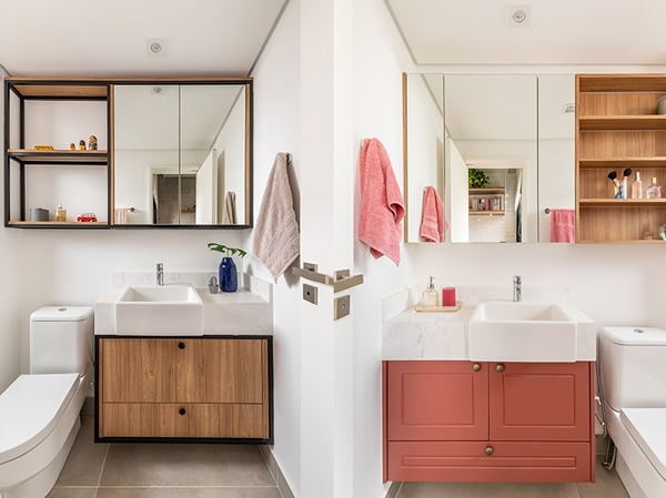 Para os banheiros dos filhos, o arquiteto Pietro Terlizzi manteve o layout. Na área do menino (à esq.), dois nichos com serralheria evocam um décor jovial, enquanto no banheiro da menina (à dir.), o rosa se sobressai na marcenaria da SCA Jardim Europa | Fotos: Guilherme Pucci