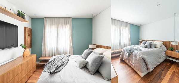 Para o quarto principal do casal, a madeira entrou em cena para a tão almejada sensação de bem-estar e, nesse mix, fica evidente a combinação do freijó no lambri e na cômoda e o cumaru para o piso.