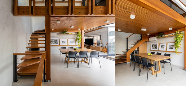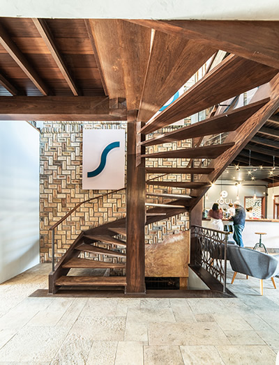 Neste coworking projetado pelo arquiteto Pietro Terlizzi, a escada foi concebida em madeira maciça justamente para ser mais leve. O corrimão acompanha a mesma referência de material e fica praticamente imperceptível | Foto: Guilherme Pucci