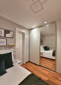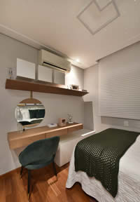 Ao acompanhar o crescimento da filha do casal, o quarto da menina deixou de ser infantil e passou a ter um ar mais maduro. A arquiteta Rosangela Pena apostou em uma paleta neutra com toques de verde musgo nos detalhes e, na marcenaria, uma combinação de guarda-roupa com porta de correr revestida por espelho e uma penteadeira para os momentos de autocuidado. “Para deixar o descanso ainda mais gostoso, mantivemos o piso de madeira e projetamos a cabeceira estofada e uma iluminação muito leve”, acrescenta.