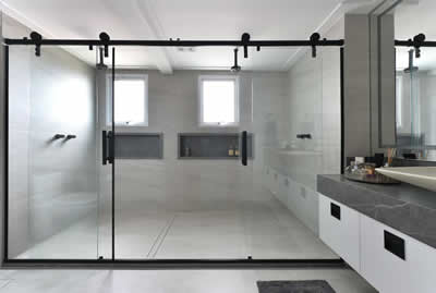 Assim como os outros cômodos, o banheiro segue a proposta elegante. Com o predomínio dos tons claros, detalhes em preto como o do espaçoso box, além dos metais, deixou tudo ainda mais arrojado| Foto: Sidney Doll