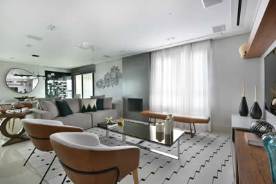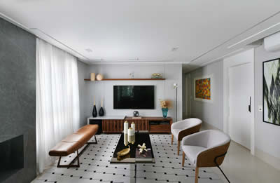 Totalmente repaginada, a sala de estar impressiona pela elegância que se destaca pelos revestimentos e o mobiliário selecionado pela arquiteta. A pedido da cliente, que se queixava dos tons escuros do ambiente, Rosangela investiu em cores neutras. Off white e com desenhos discretos, o tapete se harmoniza com as com as poltronas e sofás, além do amadeirado que remete ao aconchego, em um discreto contraponto com a mesa de centro, objetos decorativos e o mix de almofadas.