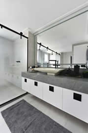 No banheiro do casal, a bancada em lâmina ultracompacta e o gabinete com puxadores de metal refletem elegância para o espaço. A cuba de apoio retangular e a belíssima torneira monocomando reforçam um estilo único e personalizado, além do espelho com iluminação em led frontal, perfeita para o uso diário. Por fim, o box acompanha a proposta do local. “A sua serralheria preta que acompanha as cores de torneiras e chuveiros”, conclui Rosangela.