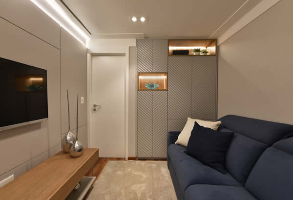 Na ala íntima do apartamento, a inspiração intimista ganhou forma. A sala de TV, por exemplo, é um ambiente super agradável, onde Rosangela otimizou o pequeno espaço com um décor minimalista e de tons neutros, propícios para horas de calma e relaxamento. Na lateral, o armário embutido, com portas ripadas e nichos iluminados, adiciona funcionalidade.