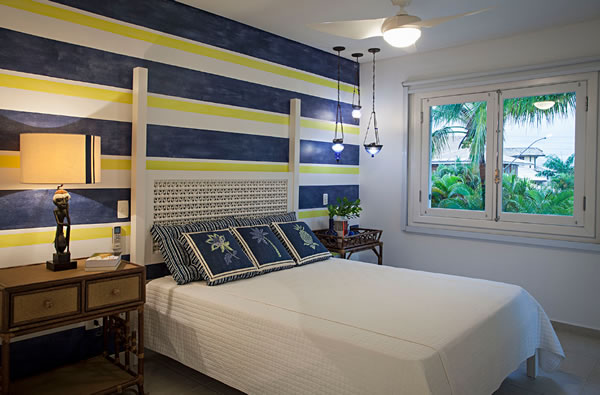 Exemplo perfeito da combinação do azul com outras cores. Amarelo foi eleito para compor uma das paredes do quarto, visando proporcionar aquela sensação maravilhosa de uma casa de veraneio | Korman Arquitetos | Foto: Gui Morelli