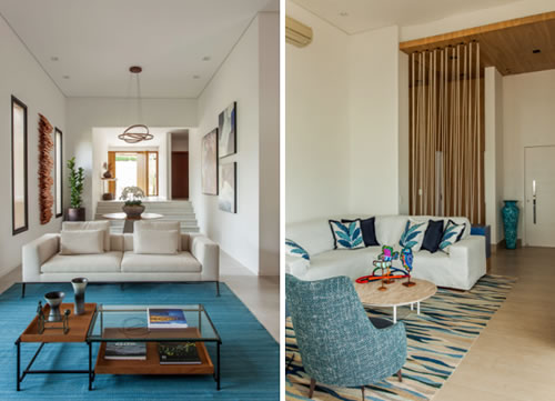 Com o mobiliário marcado pelo minimalismo, o tapete azul claro entra para ‘quebrar’ a paleta clean no projeto da esquerda, ainda assim mantendo a serenidade que pauta todo o cômodo | Projeto: Korman Arquitetos | Foto: Eduardo Pozella