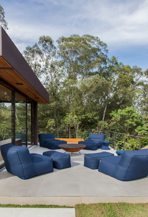 Aqui, o lounge foi criado com o intuito de ser um espaço intimista, onde se reúnem amigos e familiares. O mobiliário azul casa perfeitamente bem com esse objetivo, dando um ar acolhedor e tranquilizante aos momentos especiais | Projeto: Korman Arquitetos | Foto: Eduardo Pozella