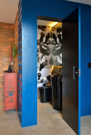 Apesar de não existir na planta original, o lavabo se tornou um dos destaques deste projeto – ele foi executado com um portal em laca azul, com desenhos em relevo, cheio de personalidade | Projeto: Korman Arquitetos | Foto: Sérgio Luiz Jorge