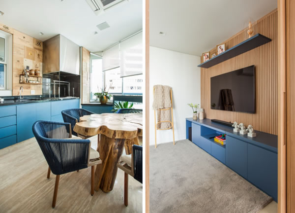 Marcenaria azul é opção para quem ama a cor e deseja trazer um toque vibrante ao cômodo — claro, sem perder a elegância. Na primeira foto, as cadeiras, com encosto em corda náutica azul, ajudam a arrebatar a varanda gourmet, que também tem a marcenaria da bancada no tom petróleo. À esquerda, o rack azul se complementa com o aconchego do painel ripado da TV instalada no home theater | Projeto: Korman Arquitetos | Fotos: Eduardo Pozella