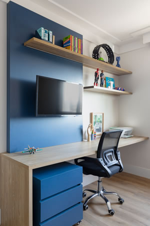 Painel azulado em perfeito alinhamento com gaveteiro de tom similar deu um novo ar ao home office no dormitório. Como a cor incentiva a criatividade e calma, é uma escolha certeira para o ambiente de trabalho | Projeto: Korman Arquitetos | Foto: Julia Novoa