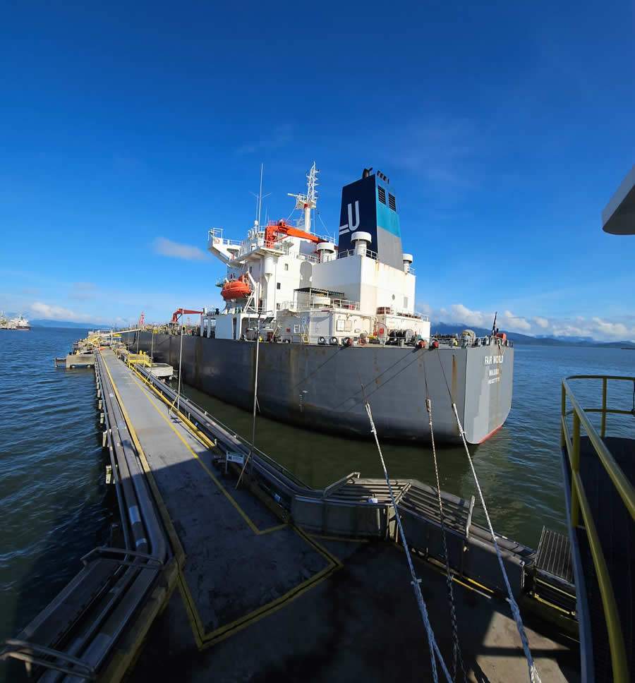 Com 228,19 metros de comprimento, o “Fair World” ocupou toda a extensão do píer privado, preparado para receber navios com o mesmo porte e com potencial para movimentar esse volume de produtos.