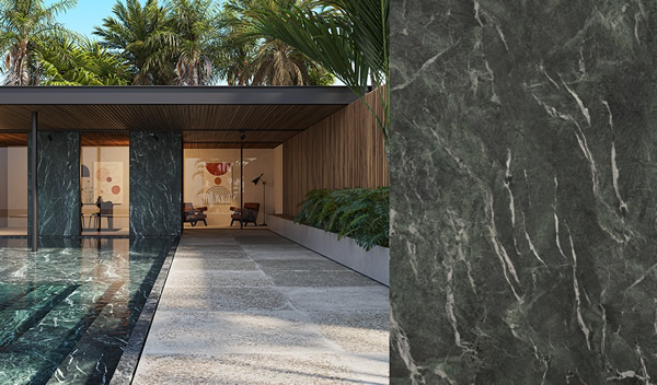 O Mármore Verde da Série Alpi, da Roca Cerámica, é encontrado no Superformato 120 x 250 cm. Inspiradas na pedra natural, com a reprodução fidedigna de suas nuances e variações de desenhos, as lâminas são apresentadas nas versões mate, com toque acetinado, e Micro Crystal, com brilho intenso, além da tecnologia BioSafe | Imagem: Divulgação