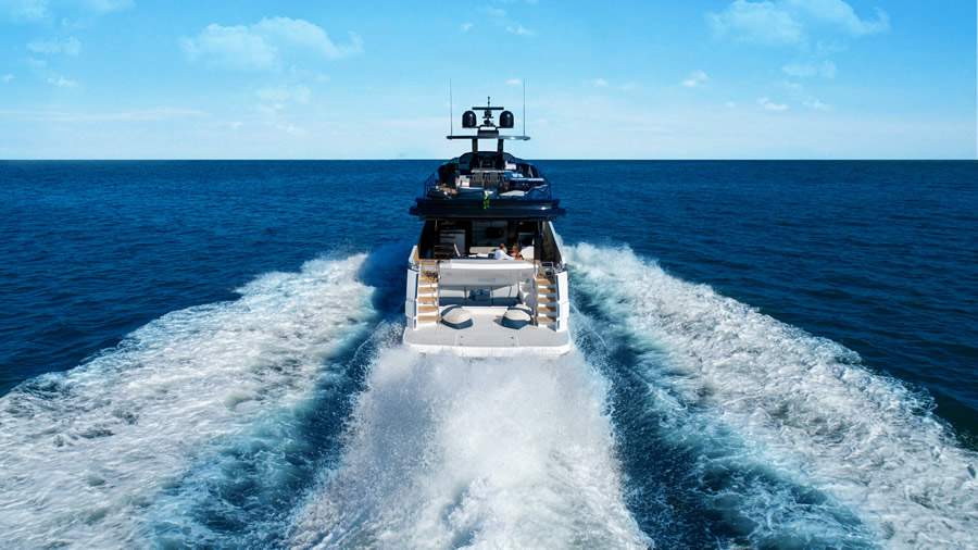 O iate tem motorização dupla V12/MAN, de 1650hp.