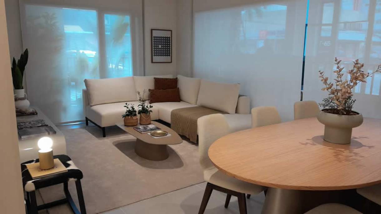 Segundo a arquiteta, uma das principais estratégias usadas no projeto do decorado do Alt 65 Home é fixar os pontos de atenção para onde o olhar das pessoas está indo e criar uma linha de visão limpa e fluída. “Tiramos todas as barreiras possíveis para que o usuário não tenha a visão interrompida, trabalhamos com menos contrastes de cores, ou seja, investimos mais nos tons monocromáticos das paredes e revestimentos, com pequenas variações”, explica ela.
