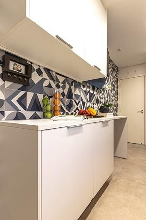 Nesta cozinha com projeto assinado pela arquiteta Gigi Gorenstein e executada pela MCC Arquitetura, o branco do mobiliário SCA Jardim Europa foi vital para destacar o revestimento geométrico aplicado na parede | Foto: Luis Gomes