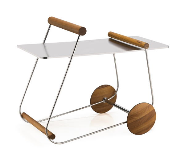 Carrinho Rolimã - Partindo da tipologia dos carrinhos de chá, o desenho do Rolimã explora as formas contínuas dos tubos metálicos que compõem sua estrutura. Cilindros e calotas de madeira servem de conectores e rodízios e criam um contraste de materiais. A peça - desenvolvida pela Riva em parceria com a designer brasileira Claudia Moreira Salles - pode ser usada como mesa lateral ou de encostar, além de ter a função de bar / Divulgação ABUP