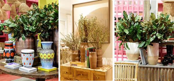 Coloridos ou com uma paleta mais neutra, os vasos da 6F Decorações agradam a todos os tipos de clientes. À esquerda, vasos coloridos de porcelana chinesa decorados à mão, com inspiração nos anos 80 e assinatura de Frederic de Luca. Ao centro, vasos de cerâmica em tons terrosos com formatos diversos. À direita, vasos de cerâmica branco estriados e com base salmão / Divulgação ABUP