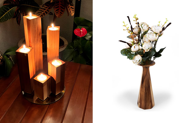 A madeira, sinônimo de aconchego, sempre presente nas decorações biofílicas, também continua em alta em artigos para a casa. Entre os exemplos estão os suportes para velas e os vasos da ARZ Home Design / Divulgação ABUP