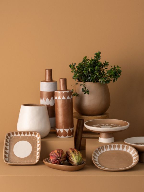 As paletas neutras e terrosas aparecem também nas bandejas orgânicas da Linha Pottery, da Vintage and cool, produzidas em madeira, mas com efeito cerâmico / Divulgação ABUP