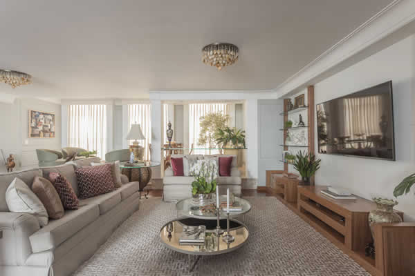 A arquiteta Marta Martins aproveitou os sofás dos moradores e apostou em almofadas. Já a mesa de centro nova deu um toque de modernidade sem “bigar” com o restante da decoração, inclusive com o móvel da TV, que apenas foi pintado | Foto: Thiago Travesso