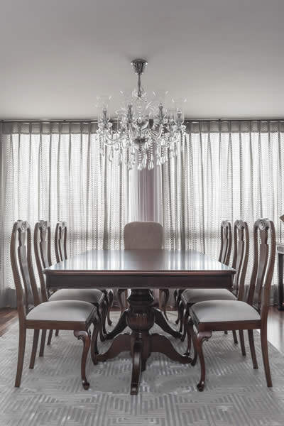 A enorme mesa continuou exuberante na casa, passando apenas por uma restauração da madeira e troca nos estofamentos das cadeiras. O lustre também continuo no projeto assinado pela arquiteta Marta Martins, que agregou um novo tapete no espaço | Foto: Thiago Travesso