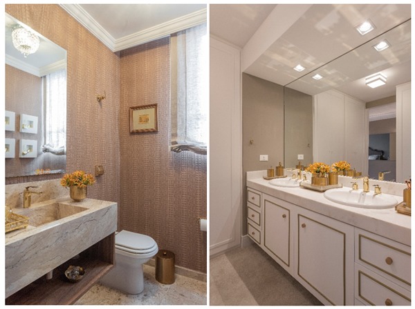 No lavabo, o piso foi mantido enquanto todo o restante sofreu alterações, desde o papel de parede até a nova pia esculpida. Já o banheiro ganhou um gabinete novo e os metais das torneiras foram alterados, mas o tampo e as pias seguiram os mesmos | Fotos: Thiago Travesso