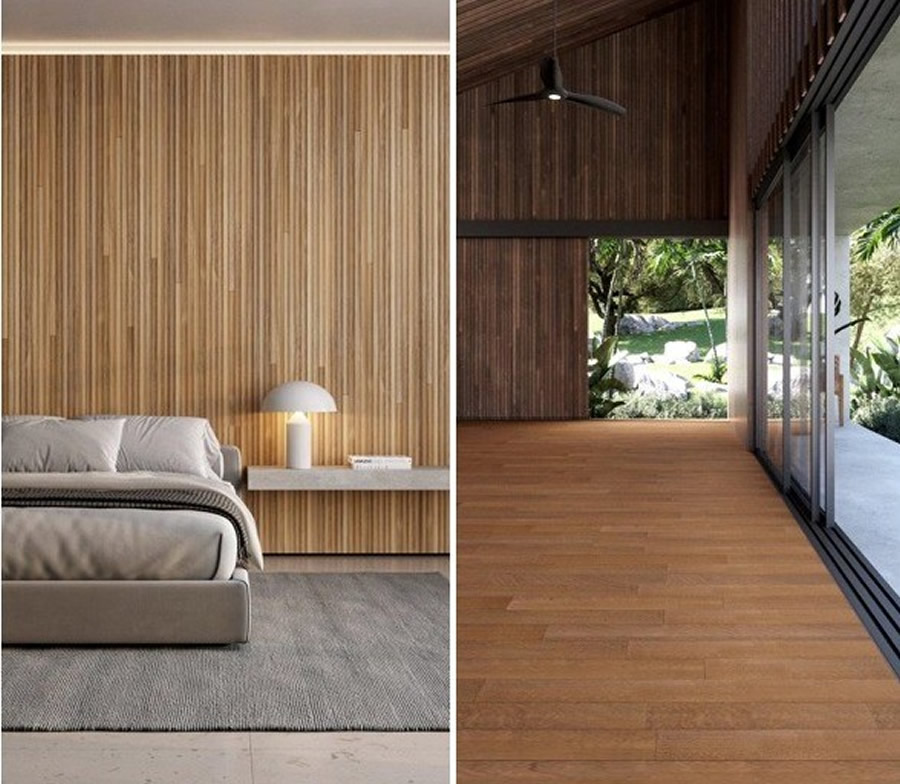 À esq., parede em Ripado Duas Serras, de Tauari, da Akafloor. À dir, na parede, Ripado duas Serras, feito de Cumaru. E piso Tauari Serra Talhada. Fotos: Divulgação.