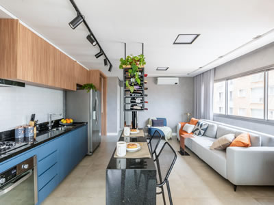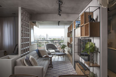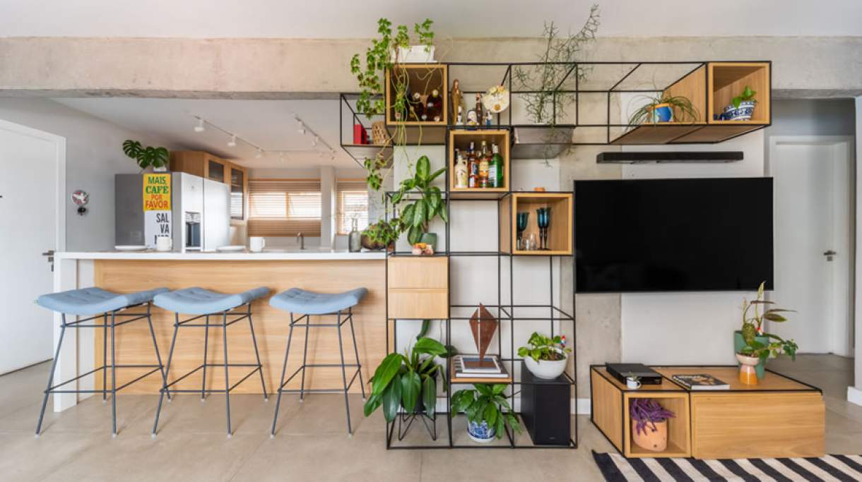 Móveis e ambientes multifuncionais são excelentes opções para quem irá morar em apartamentos pequenos. Dentro do projeto de Bruno Moraes, entre alguns exemplos, o móvel atrás do sofá funciona como bar e bancada de trabalho. Além disso, o nicho dentro do box também garante a economia de espaço.