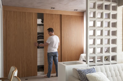 Muitas vezes na empolgação de arrumar tudo, os moradores se esquecem de que, no decorrer do dia a dia, uma série de novas necessidades poderão aparecer. “A dica é pensar em móveis que se adaptem a essas mudanças”, afirma Bruno. Entre os exemplos, ele mostra um móvel ripado do seu apartamento, que é dinâmico – guarda as louças da cozinha e mantém uma estética agradável, pois fica camuflado.