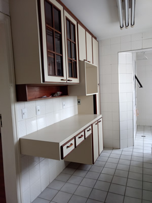 Com uma linguagem antiga, tanto no layout, quando nos materiais empregados, os cantos chanfrados da bancada da cozinha eram inconvenientes e não permitiam o uso sonhado pelos clientes. Na reforma, a bancada de quartzo acompanhou a face da janela, tirando a posição anterior do fogão, e os revestimentos foram substituídos, tanto no piso, quanto os azulejos antigos da parede. Para suavizar a iluminação natural proveniente da janela com esquadrias pretas, a persiana rolo cumpriu o papel de suavizar as duas questões.