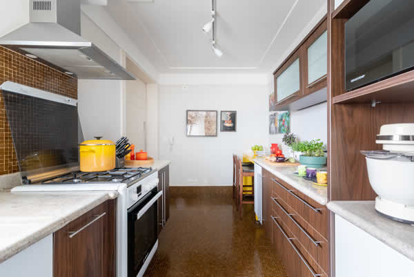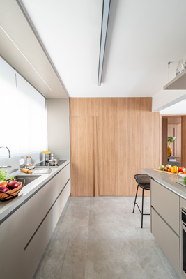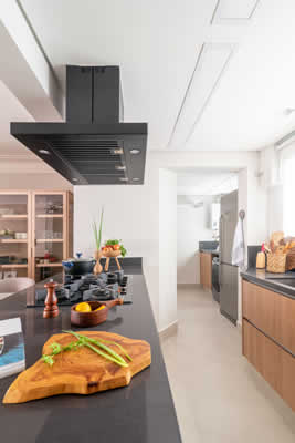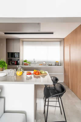 A cozinha, que antes era apertada e ficava isolada do restante da área social, não agradava os proprietários. Bastou a retirada de uma das paredes para ganhar mais amplitude, conquistando uma circulação mais fluida e aumentando a luz natural. “Além disso, os nossos clientes ganharam uma bancada de quartzo para as refeições rápidas, que virou um dos cantos mais usados no dia a dia”, conclui Isabella.