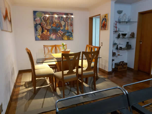 Para resolver as questões práticas, ela ganhou amplitude ao abrir um vão entre a sala de jantar que, por sua vez, recebeu a instalação de porta de correr. Para as refeições rápidas, o aparador com rodinhas é uma ‘mão na roda’, já que pode ser levado para onde for necessário, além de servir para as refeições rápidas.