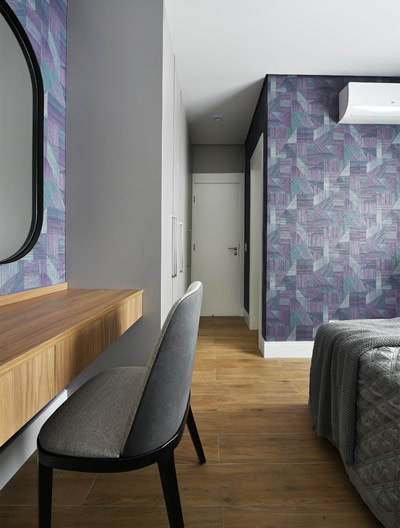 Nesse dormitório, a leveza e conexão da madeira foi emulada por meio do porcelanato escolhido pela arquiteta| Projeto Rosangela Pena Arquitetura| Foto: Sidney Doll
