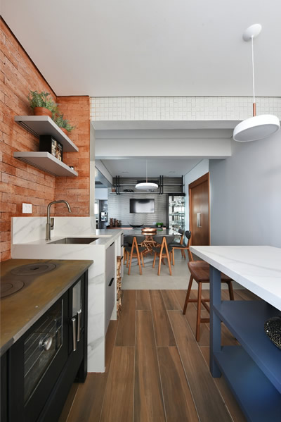 Nesta cozinha, o porcelanato corrobora com o décor rústico da parede com tijolinhos e outras duas propriedades importantes: o conforto térmico e longevidade do produto em um local com grande circulação de pessoas | Projeto Rosangela Pena Arquitetura| Foto: Sidney Doll
