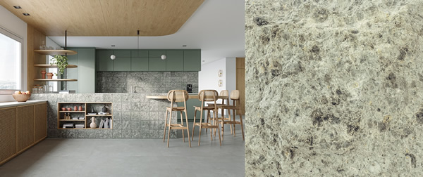 O suave relevo da Série Swell simula, meticulosamente, os desenhos e tonalidades verdes da pedra hijau. Gress, na versão mate e 20 x 20 cm, pode ser designado tanto para paredes quanto para pisos. | Imagem: Divulgação Roca Cerámica