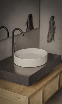 A suavidade do desenho e bordas finas da cuba de apoio D4 é complementada pela instalação com o upper deck | Foto: Divulgação Celite