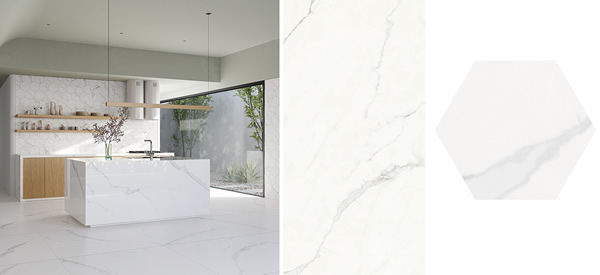 Graças ao encaixe perfeito das peças que formam um desenho contínuo, com ritmo e movimento, os insertos com relevo 3D oferecem inúmeras possibilidades para decorar paredes internas e externas e seu alto relevo é valorizado pelo efeito de luz e sombra, como também é um convite ao toque. O revestimento s e i sgonal complementa a série ao conciliar a estética retrô do formato à sofisticação do visual do mármore.