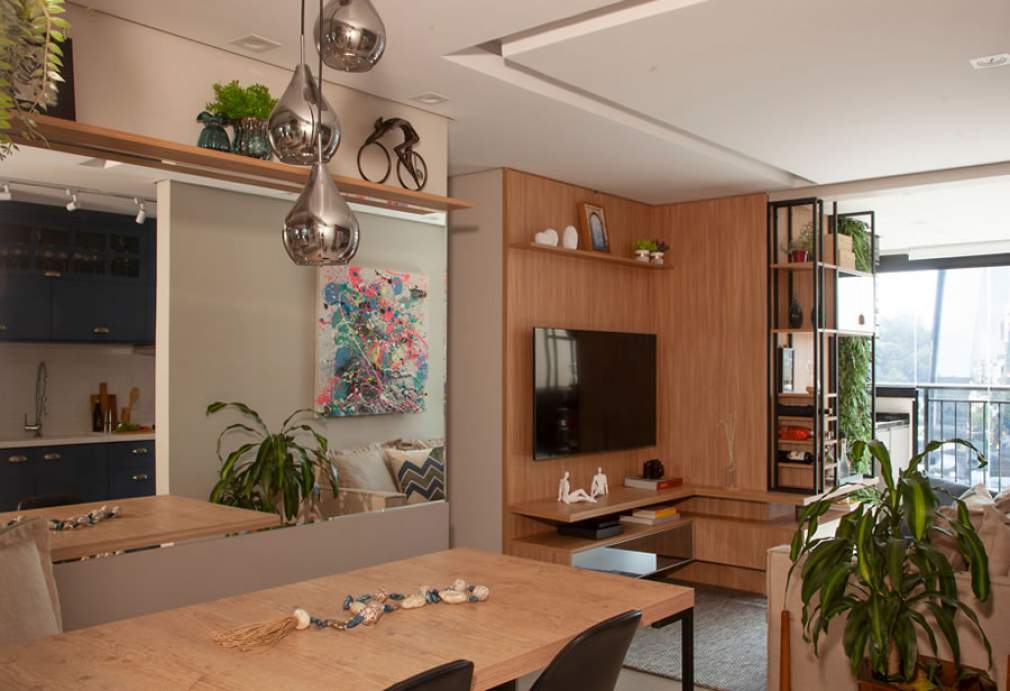 Responsável por trazer cor e funcionalidade a esta sala e cozinha bem integradas, a marcenaria esconde a geladeira e a área de serviço neste apartamento de 83 m³ e é apenas um de muitos exemplos das soluções possíveis para resolver o décor | Projeto BMA Studio | Foto: Luís Gomes
