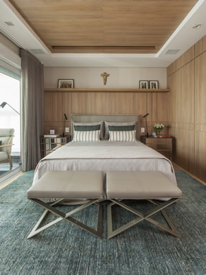 Nesse dormitório assinado pelas profissionais Danielle Dantas e Paula Passos, a leveza do bege presente na madeira que reveste as paredes e o teto | Projeto do escritório Dantas & Passos Arquitetura | Foto: Edu Pozella