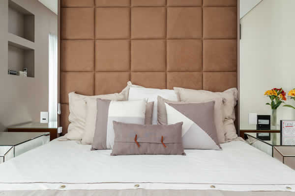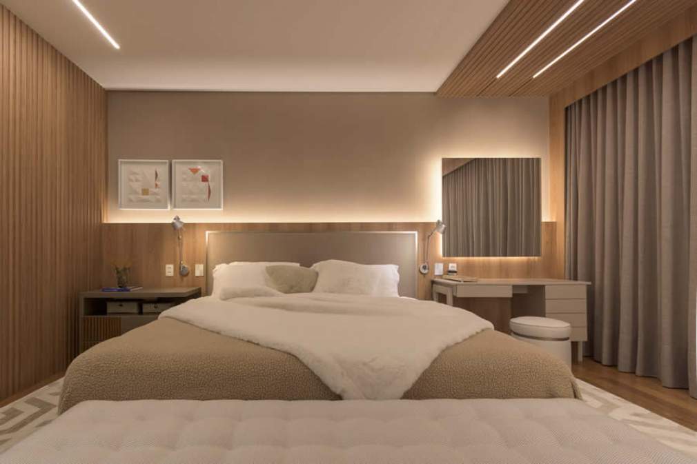 A definição da paleta de cores e texturas na parede contribui para a elegância e conforto, assim como as arquitetas Paula Passos e Danielle Dantas realizaram nesse dormitório de casal | Projeto do escritório Dantas & Passos Arquitetura | Foto: Eduardo Pozella