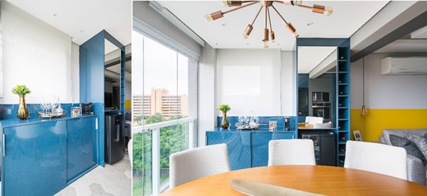 Na varanda integrada do pequeno apartamento, a adega ganhou uma marcenaria personalizada e inteligente na cor azul (execução da SCA Jardim Europa). As garrafas de vinho foram instaladas nas laterais do móvel, enquanto a climatizadora do ar-condicionado e o frigobar ficam no espaço inferior do móvel. Um louceiro e um aparador organizam taças e outros utensílios de uso no bar| Projeto: Spaço Interior Arquitetura | Fotos: Kadu Lopes