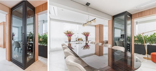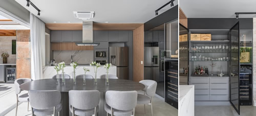Em projetos realizados em cômodos integrados, a orientação da arquiteta é reforçada, afinal a adega precisará servir todos os setores sociais e, estando em um local de passagem, conseguirá oferecer uma visão 360° para os moradores e visitantes. É recomendado também considerar uma mesa de jantar ou um bar adjacente.