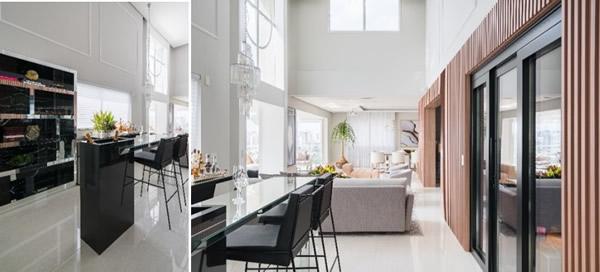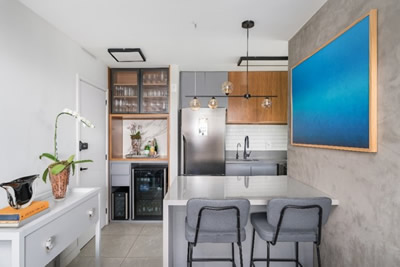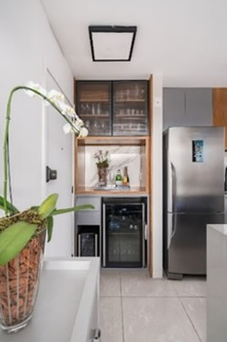 É cada vez mais comum morarmos em apartamentos compactos e com metragens mais limitadas. Mas isso não significa que não exista espaço para uma adega ou cantinho do bar, caso seja o desejo dos moradores. “Com a marcenaria, personalizamos a área disponível, trabalhando na vertical e criando prateleiras e nichos”, destaca Ana, que adora trabalhar todos os centímetros disponíveis.