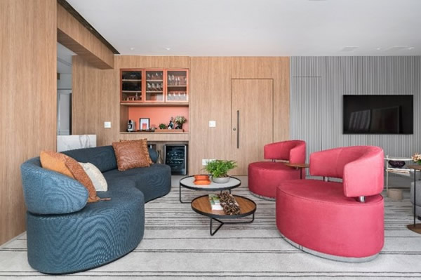 Os cantinhos do bar e do café se mesclam nessa aconchegante e moderna sala de estar. Para o espaço, o revestimento da marcenaria, na cor laranja, chama atenção para as bebidas e concebe um cenário leve e descontraído. Os sofás coloridos entregam a atmosfera perfeita para conversas e momentos relaxantes | Projeto: Spaço Interior Arquitetura| FOTO: Kadu Lopes