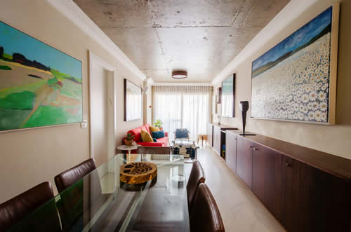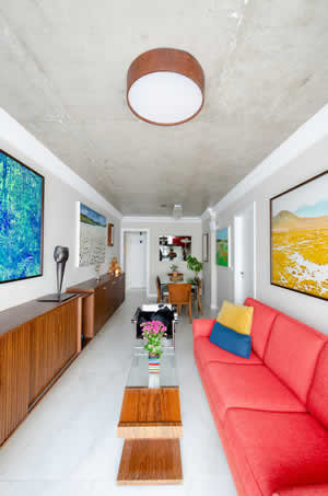Ao entrar na residência, o living ladeado de quadros artísticos já chama a atenção das visitas e se torna o cartão postal do apartamento. A atmosfera contemporânea foi combinada com o uso de madeira bem trabalhada e revestimentos claros, como o piso de porcelanato e a cor das paredes, produzida especialmente para as paredes do projeto. “Além disso, idéia de deixar a laje original foi uma decisão com o intuito decontrastar com o piso, quebrando um pouco do branco no espaço, e assim conseguimos dar destaque às obras de arte, resultando em um living com efeito mais rústico e natural”, explica Felipe.